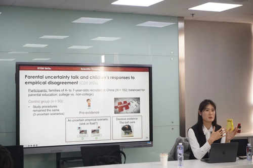 2 科学思维发展:不确定性语言的作用与家庭背景差异 科学思维的发展是本次分享的另一核心,杨博士团队聚焦实证性分歧,对5-11岁中美儿童开展研究,发现儿童科学思维随年龄成熟,随年龄增长,儿童在无证据时更易考虑多种假设的可能性,看到证据后均能进行正确判断;团队同时指出研究局限,后续将用儿童无先验知识的新奇科学情景优化设计。 针对儿童科学思维的个体差异,团队还探究家长不确定性语言的影响,对4-7岁儿童家庭分组研究发现,家长不确定性语言丰富度与儿童成熟科学思维正相关,说明亲子互动中家长的语言对儿童的科学思维有重要作用。